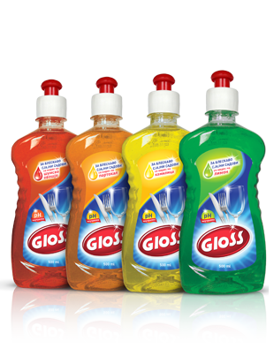 Gloss средството за рачно миење на садови формира обилна и стабилна пена и ефикасно ги елиминира и најтвродокорните маснотии . На садовите им дава блескав сјај и остава пријатен мирис. Не содржи полифосфати кои негативно дејствуваат на човековата околина. Gloss средството за рачно миење на садови достапно е во неколку мирисни ноти: лимон, портокал, шумско овошје и камилица.